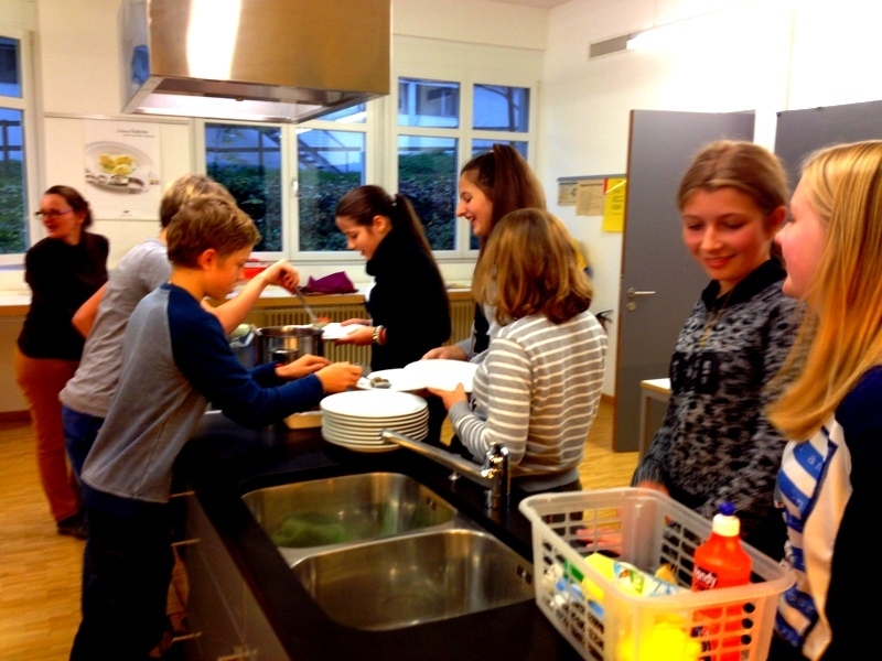 Nachdem wir also unsere Favoriten ausgewählt hatten und Gruppen bilden konnten, wer mit wem was wie kocht, ging`s ans Einkaufsliste schreiben. Voller Vorfreude sind wir dann alle zusammen zum Coop und haben uns ausgetobt…nachdem die Einkaufskörbe gefüllt waren und wir alles hatten was wir brauchten, ging es zurück zur Schulküche der Engelwies Schule. Die nächsten 2 Stunden wurde geschnippelt, geschält, gebrutzelt und gebraten was das Zeug hält…die große Schulküche war voll mit leckeren Gerüchen und eifrigen Köchinnen und Köchen. Die Jugendlichen und wir Betreuer hatten jede Menge Spaß unsere Gerichte zuzubereiten, zu spitzeln wie weit die anderen schon sind und immer wieder mal zu naschen. Nachdem wir dann alle so weit waren, dass wir essen konnten, haben wir den großen Tisch im Nebenraum schön gedeckt und haben mit knurrenden Mägen darauf gewartet, dass die Gruppe-Vorspeise uns ihr Werk präsentiert. Nachdem wir mit den leckeren Spinat-Blätterteigtaschen durchwaren und auch den Beilagen Salat verputzt hatten, ging es mit der Hauptspeise weiter, die aus marokkanischen Hackbällchen mit Ofenkartoffeln und Joghurt-Dip bestand, was auch wirklich sehr sehr lecker war. Die Veggies haben Tortellini mit einer leckeren Tomatensoße verdrückt…zu guter Letzt gab es dann als Dessert noch Zimt-Crêpes mit Vanilleeis und Orangensorbet.
