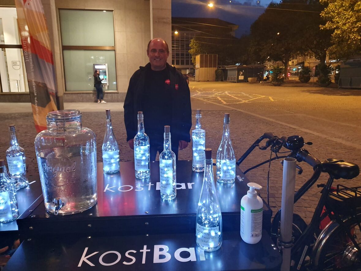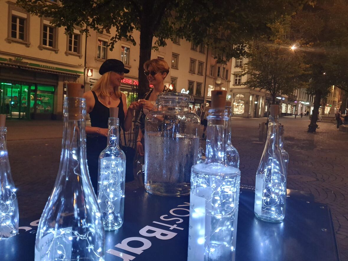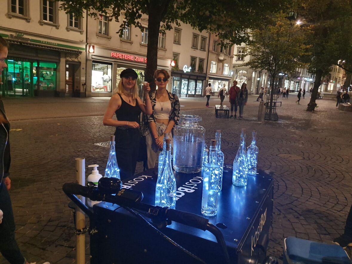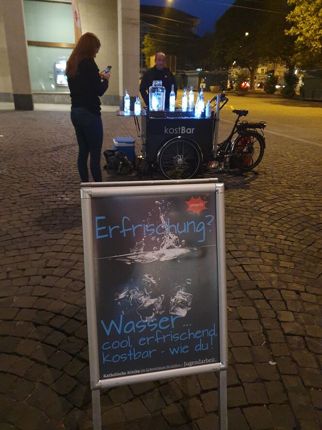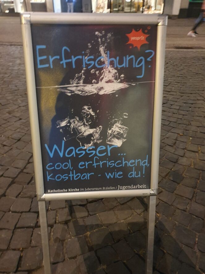Wasser - cool, erfrischend, kostbar - wie du! Mit dieser Botschaft und einem erfrischenden Schluck Wasser im Eiswürfelglas überraschten die Jugendarbeitdenden des Yesprit Teams junge Menschen auf dem Weg in den Ausgang. Es kam dabei zu vielen erfrischenden kurzen Begegnungen und Gesprächen.