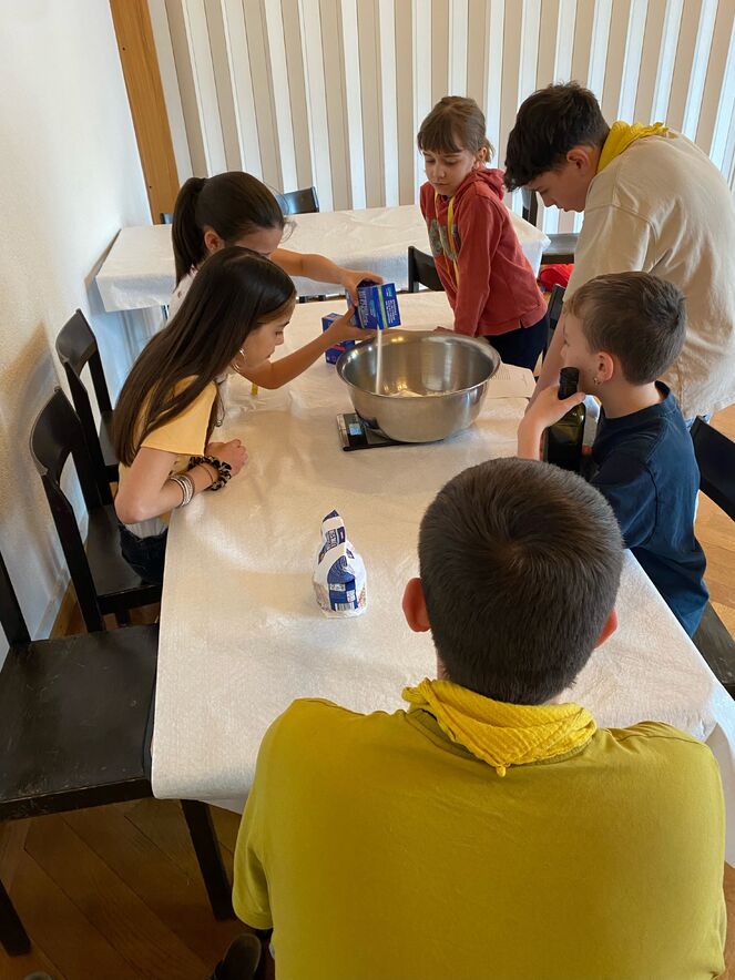 Den Salzteig haben wir mit Lebensmittelfarbe gefärbt, unglücklicherweise auch das Wallholz von dem Küchenteam. ;)