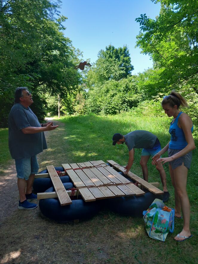 Dafür haben wir uns am Mittag um 12 beim Hauptbahnhof getroffen um nach Stromeyersdorf aufzubrechen. Wunderschön gelegen am Rhein bei Konstanz. Dort haben Kornel und Remo bald das Geheimnis ums Teambuilding-Programm gelüftet. Unter Anleitung einer externen Fachperson, Martina, haben wir in zwei Gruppen aus Pneus, Holzlatten und Seilen unsere Flosse gebaut. An dem heissen Tag haben wir uns schon da bereits aufs Einwassern gefreut! Das war dann auch riesen Spass mit verschiedenen Challenges auf dem Wasser. Niemand ist untergegangen, aber alle sind nass geworden!