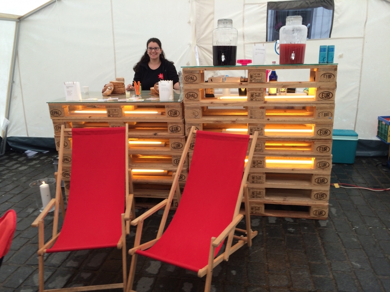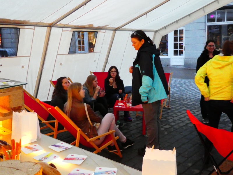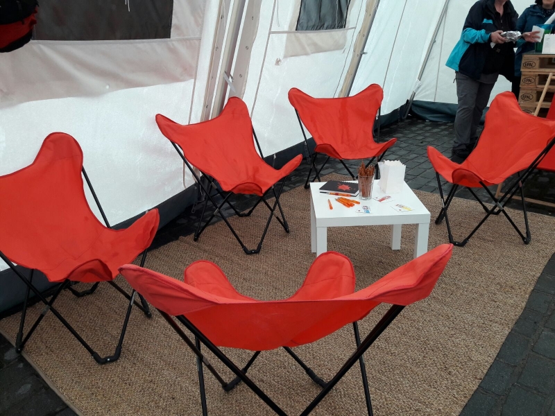 Und in der Tat folgten nicht wenige dieser Einladung. Auch andere blickten neugierig ins Zelt, blieben für eine Weile bei Snacks und Drinks. Manche machten es sich richtig gemütlich und unterhielten sich angeregt. Vielleicht hätten es mehr junge Menschen sein können, aber fürs erste Mal war der Besuch nicht schlecht, war doch die eigentliche Betriebszeit ziemlich kurz, da wir um 23.00 Uhr schon wieder alles geräumt haben mussten. Und es zeigte sich, dass wir mit diesem Projekt durchaus junge Menschen erreichen können.
