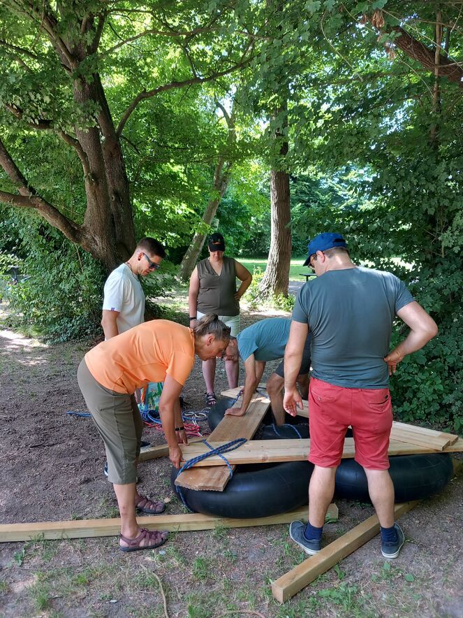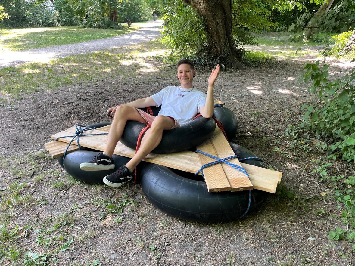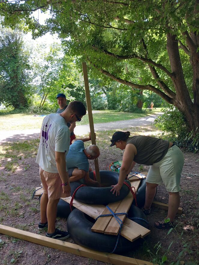 Dafür haben wir uns am Mittag um 12 beim Hauptbahnhof getroffen um nach Stromeyersdorf aufzubrechen. Wunderschön gelegen am Rhein bei Konstanz. Dort haben Kornel und Remo bald das Geheimnis ums Teambuilding-Programm gelüftet. Unter Anleitung einer externen Fachperson, Martina, haben wir in zwei Gruppen aus Pneus, Holzlatten und Seilen unsere Flosse gebaut. An dem heissen Tag haben wir uns schon da bereits aufs Einwassern gefreut! Das war dann auch riesen Spass mit verschiedenen Challenges auf dem Wasser. Niemand ist untergegangen, aber alle sind nass geworden!